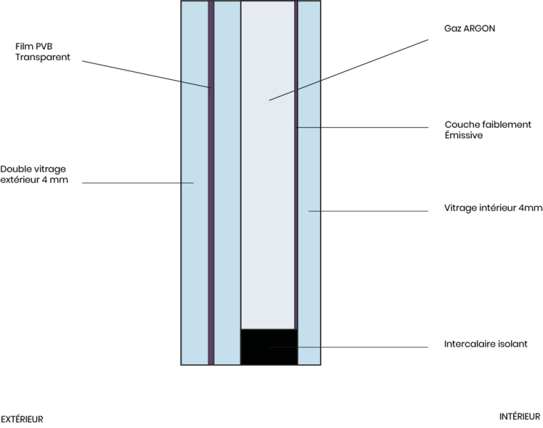 La réduction du bruit s’obtient par une juste combinaison entre épaisseur de vitrage, espace d’air entre les vitrages et l’insertion d’une ou plusieurs feuilles intercalaires de résine.